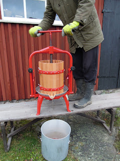 Man lägger krosset i äpplepressen i en linneduk. Man snurrar på vevarmen och vips kommer den finaste must!